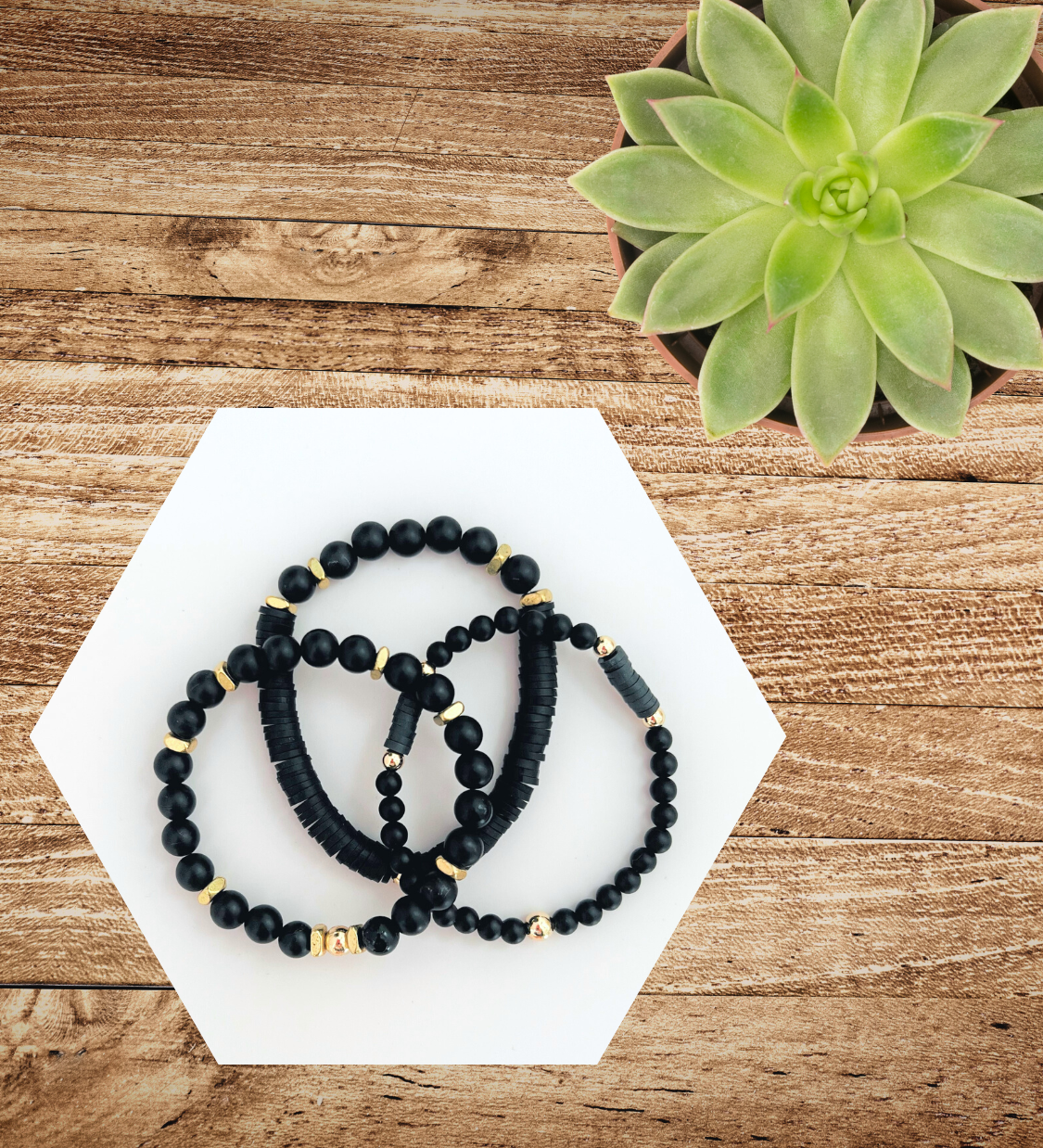 These bracelets are handmade with black heishi and onyx beads with gold and 14k gold-filled accent beads. This stack is great to wear as is, pair it with another stack, a few singles, or mix and match! Just pick your size. This stack is perfect for the trendsetter who loves to mix and match their accessories. It's the perfect way to take the guesswork out of putting an outfit together!