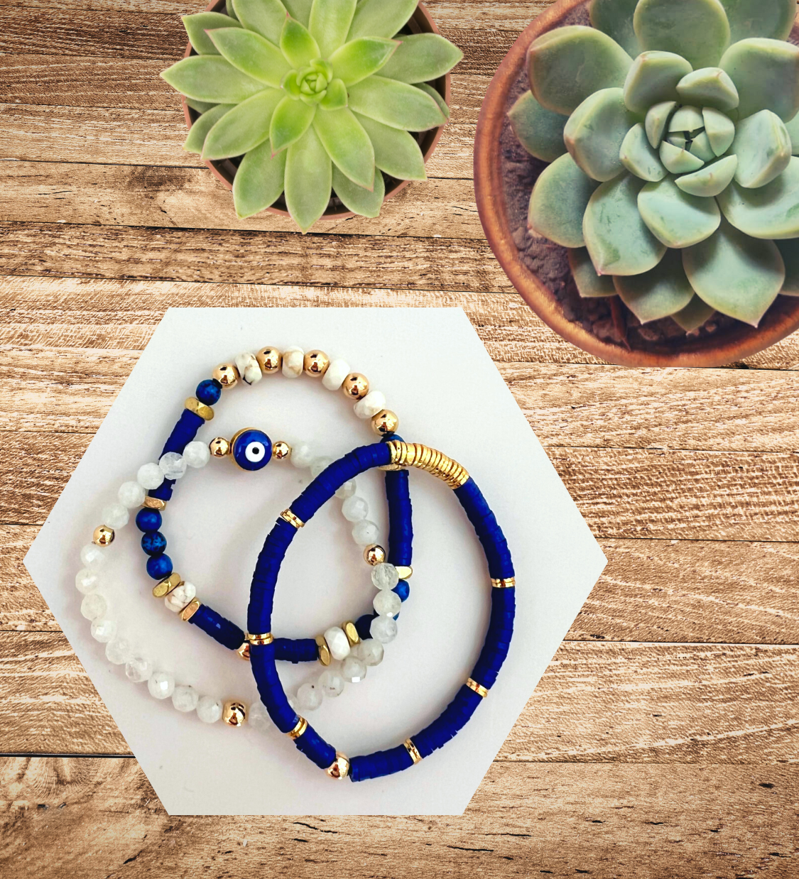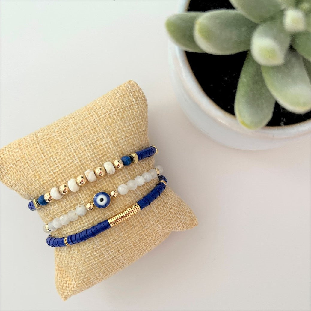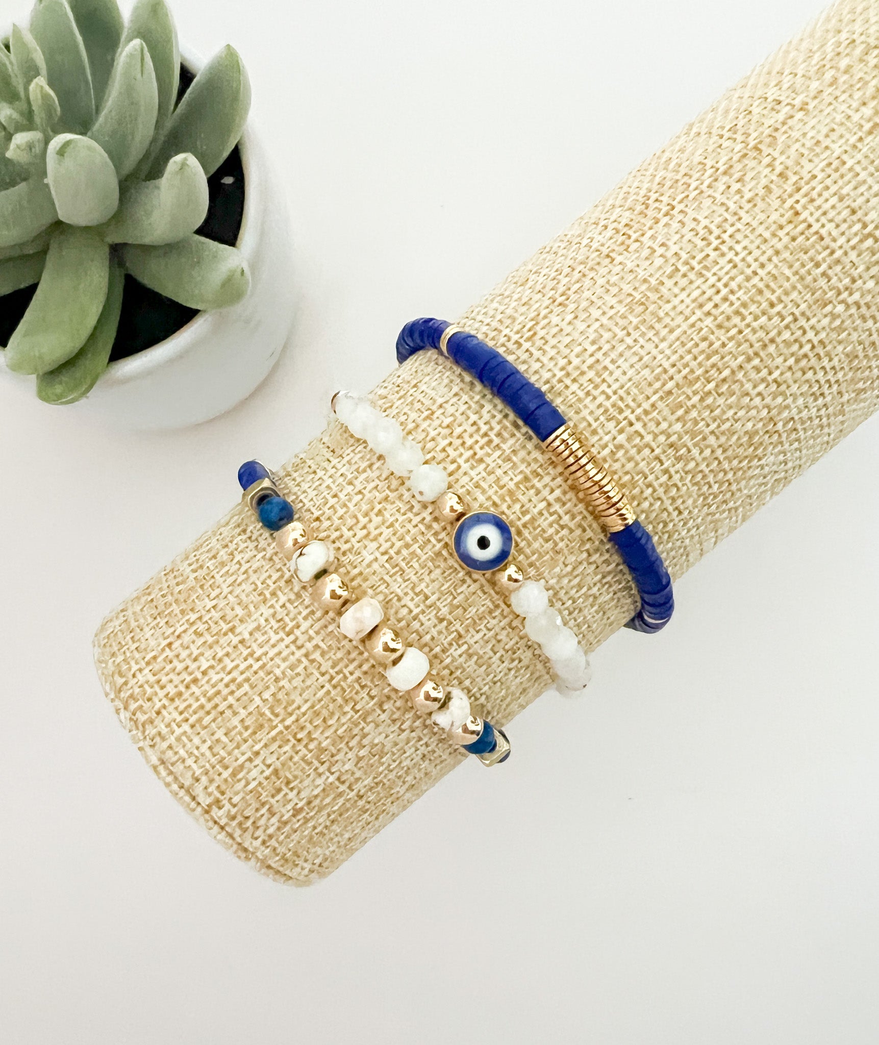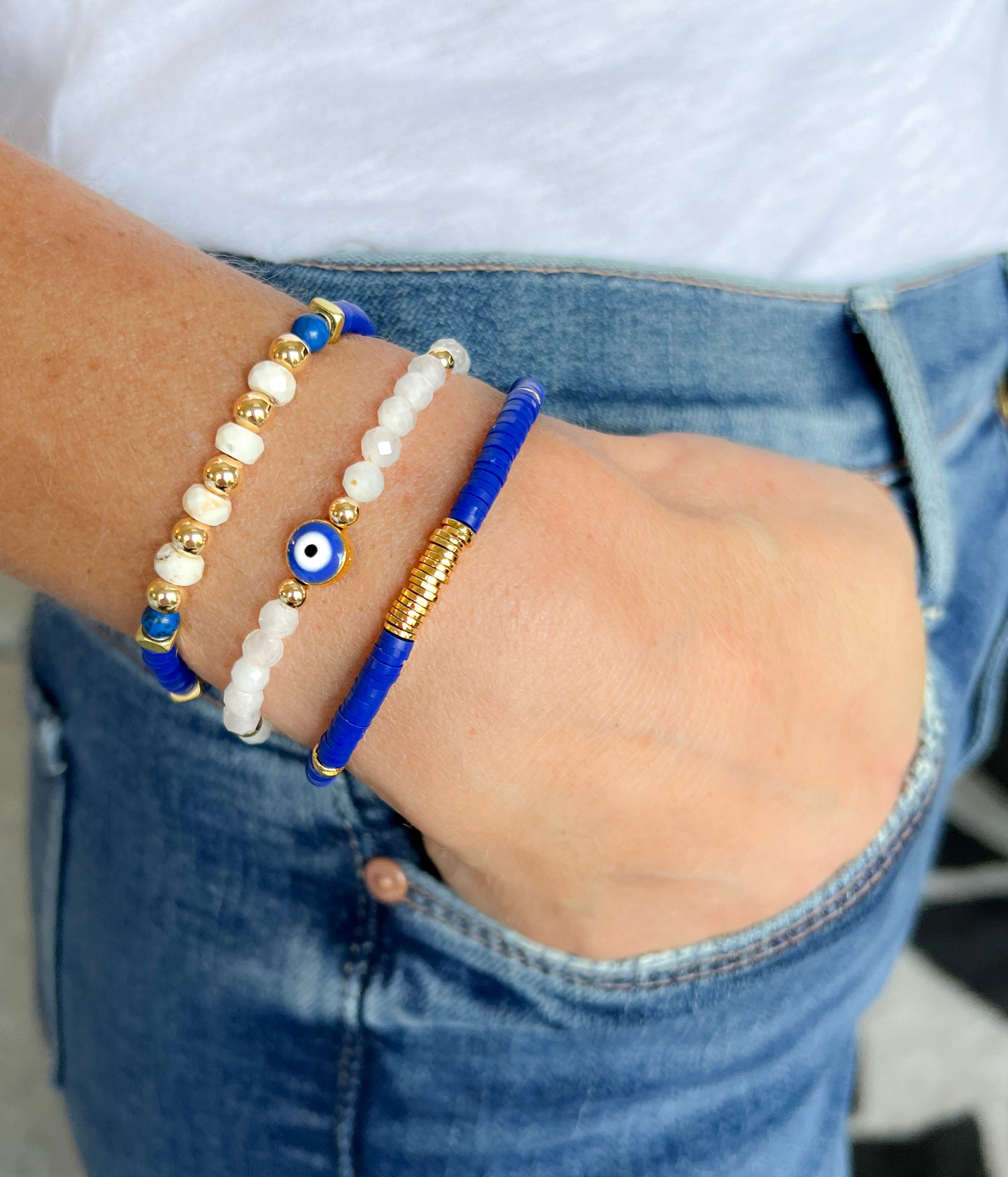 Wearing an Evil Eye charm is believed to offer protection against misfortunes and bring good luck. These bracelets are handmade with blue, ivory, and white heishi, howlite, and rondelle beads with gold and 14k gold-filled accent beads. Ready to take on life's obstacles with a little extra luck and protection? Arm yourself with this stylish, handmade accessory that's sure to turn heads!