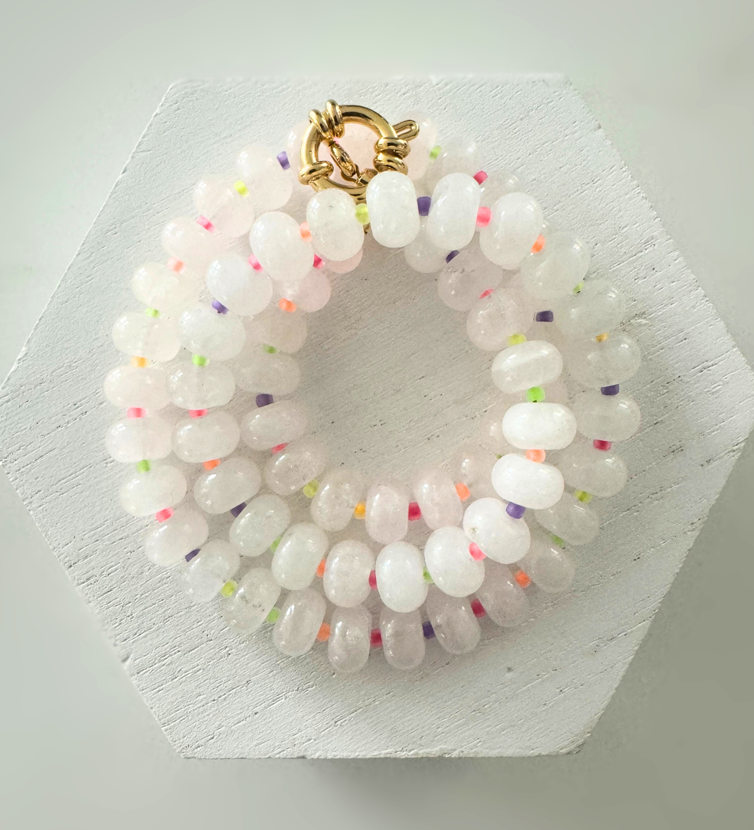 Handcrafted with white 8mm jade beads and neon glass beads in between, secured with a 12.5mm gold-plated clasp. Each necklace is 18 inches long, making it the perfect addition to any outfit. Shine bright with our one-of-a-kind design!