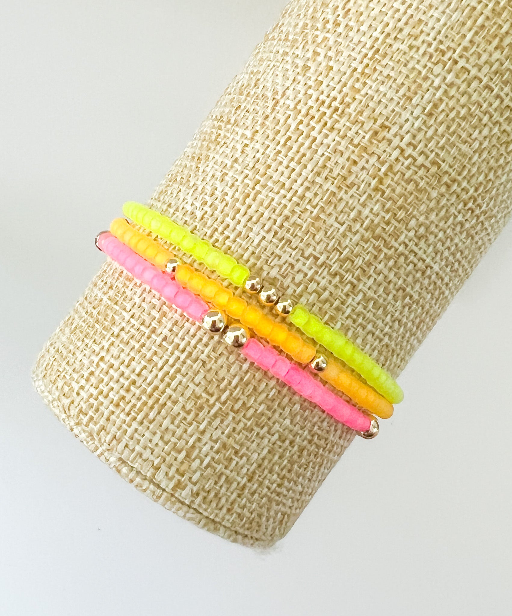 This trio of bracelets is handcrafted with 3mm neon beads and 14k gold-filled accent beads. Choose 3 colors to create your own neon stack. Scroll through the photos for some inspo!