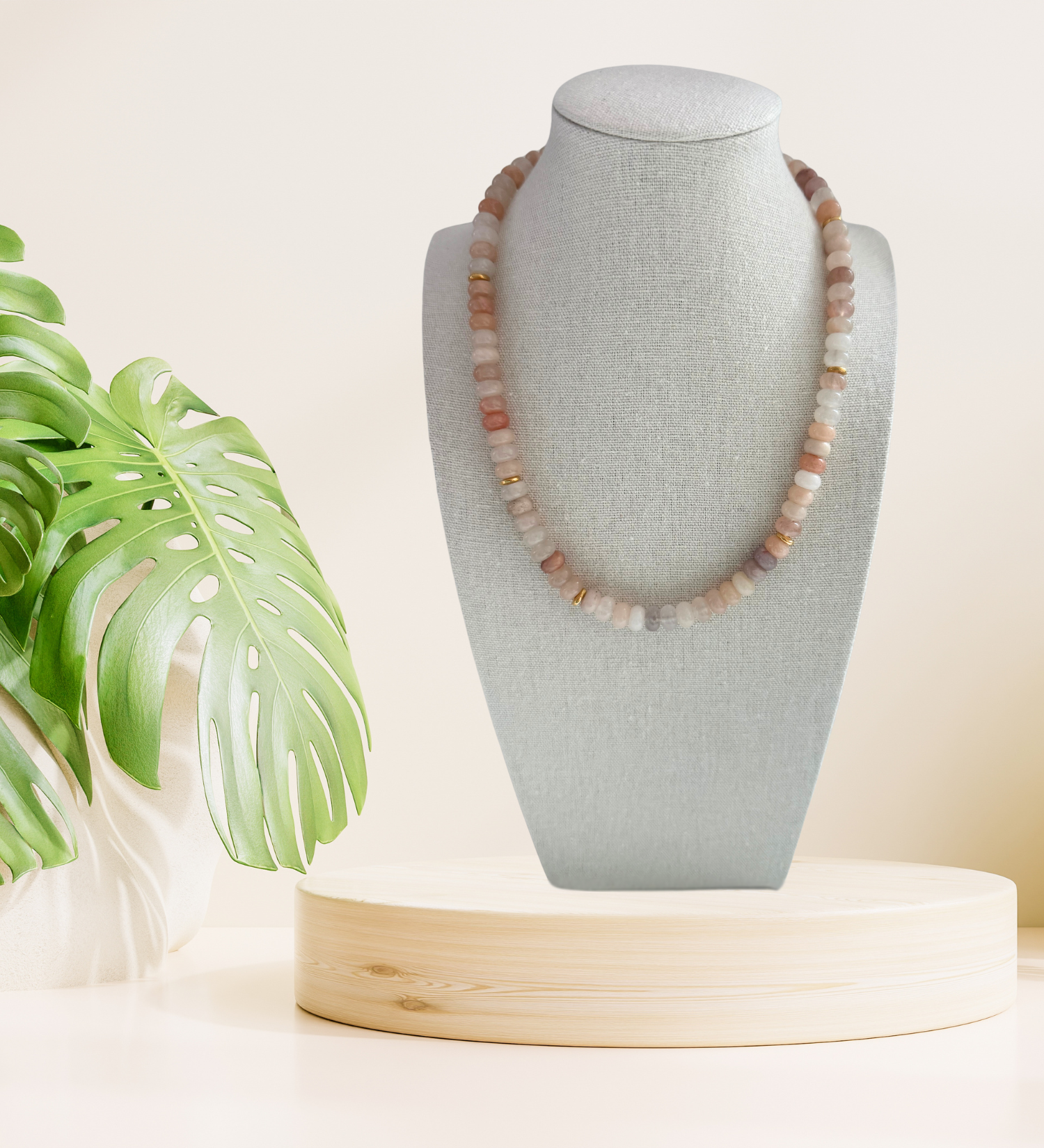 Crafted by hand using 8mm jade beads in a sandy hue, fastened with a 12.5mm clasp coated in gold. Measuring 18 inches, this versatile design complements any outfit.