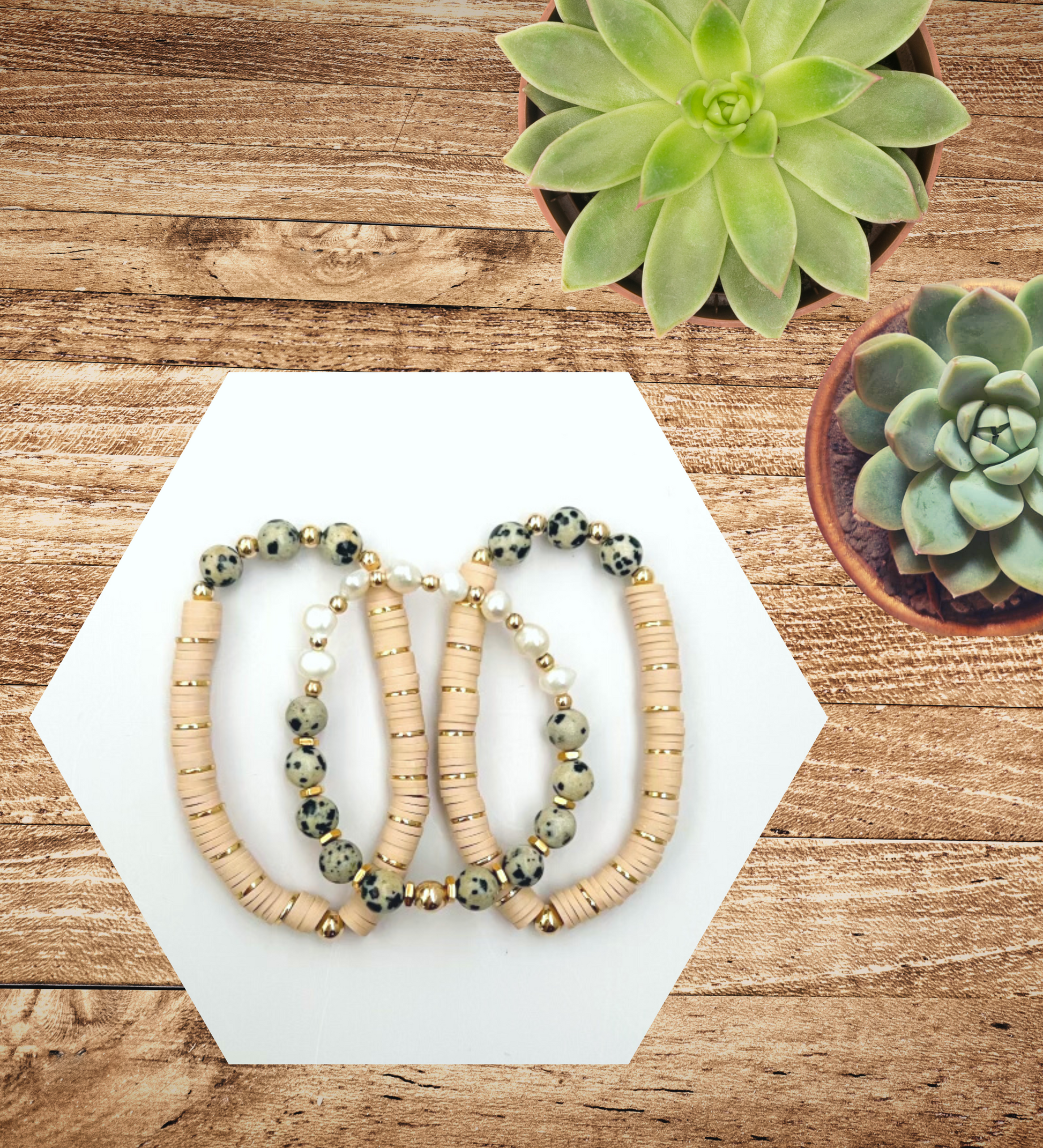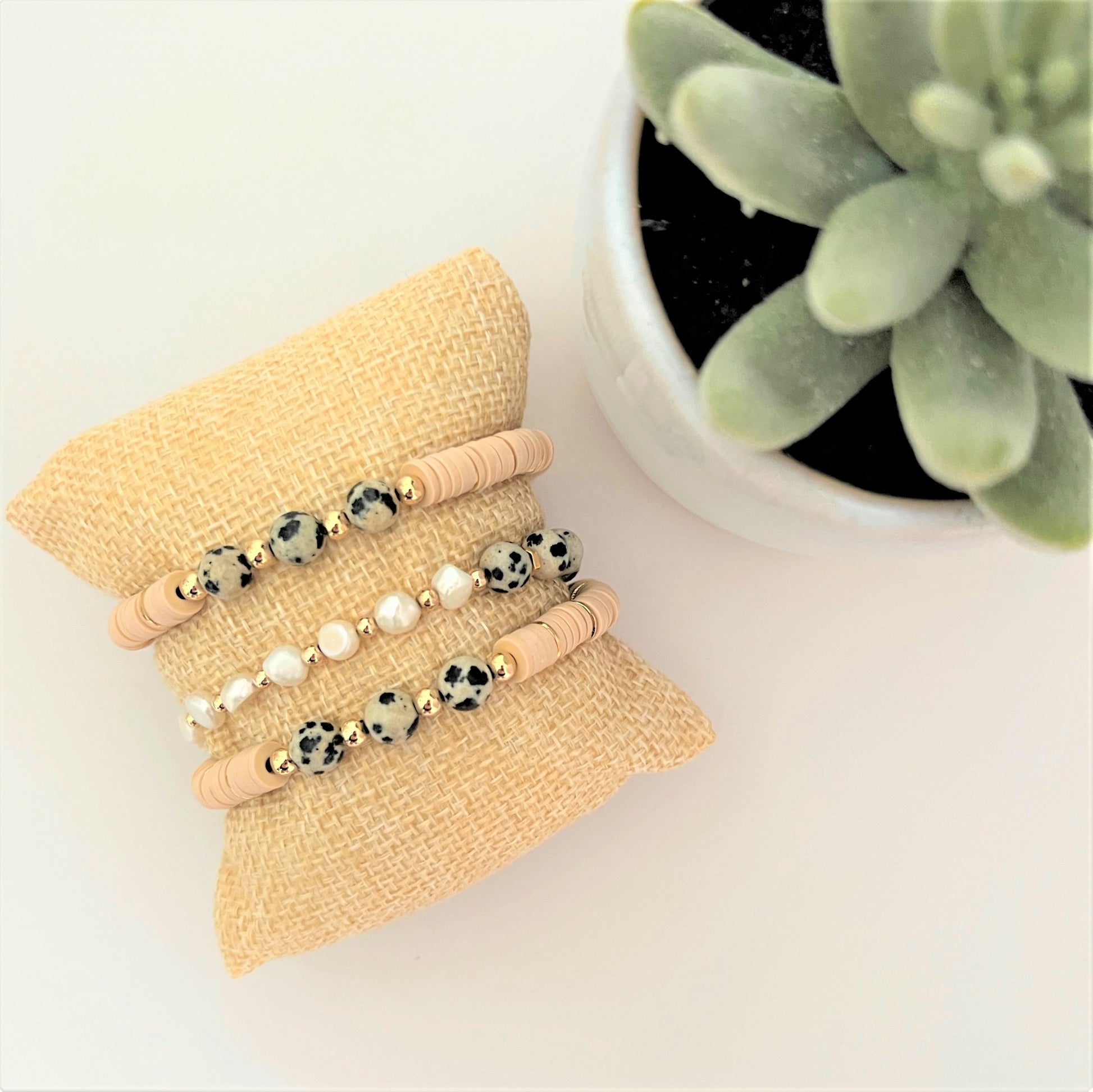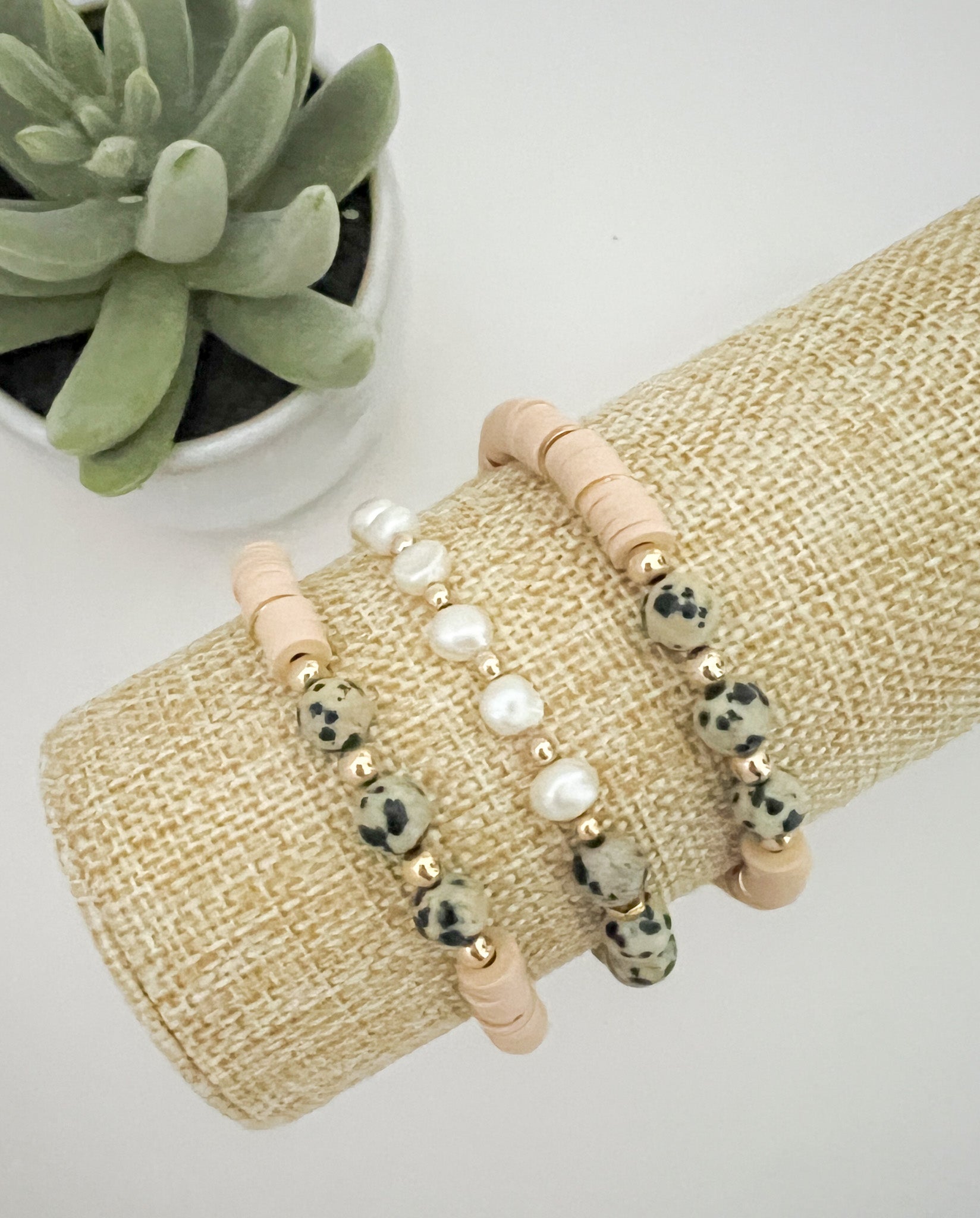 These bracelets are handmade with beige heishi beads, freshwater pearls, and Dalmatian jasper gemstones with gold and 14k gold-filled accent beads. Get your dose of nature's beauty with these one-of-a-kind pieces that'll upgrade your daily wardrobe!