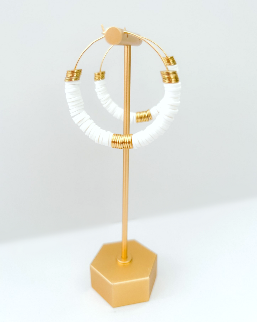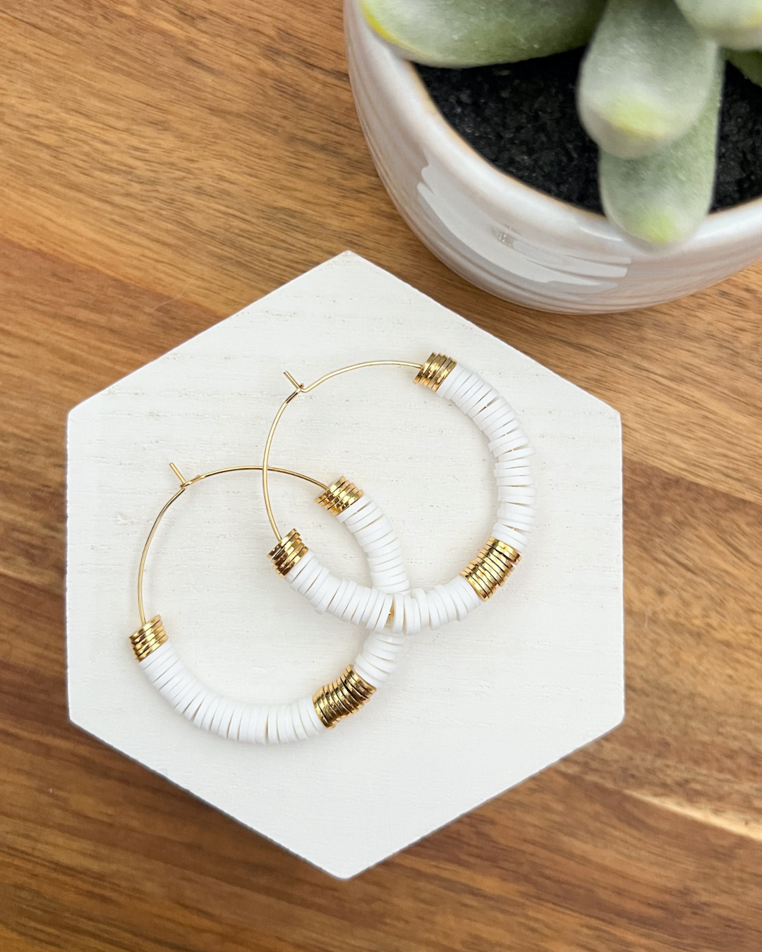 Heishi Bead earrings with gold accents. These handmade earrings are centered with a cluster of gold disc beads and surrounded by white heishi beads with gold accents at each end. A sparkle of gold to brighten up any casual look. Earrings that can take you from day to night with a simple swish of the hair (or pop of a hat!).