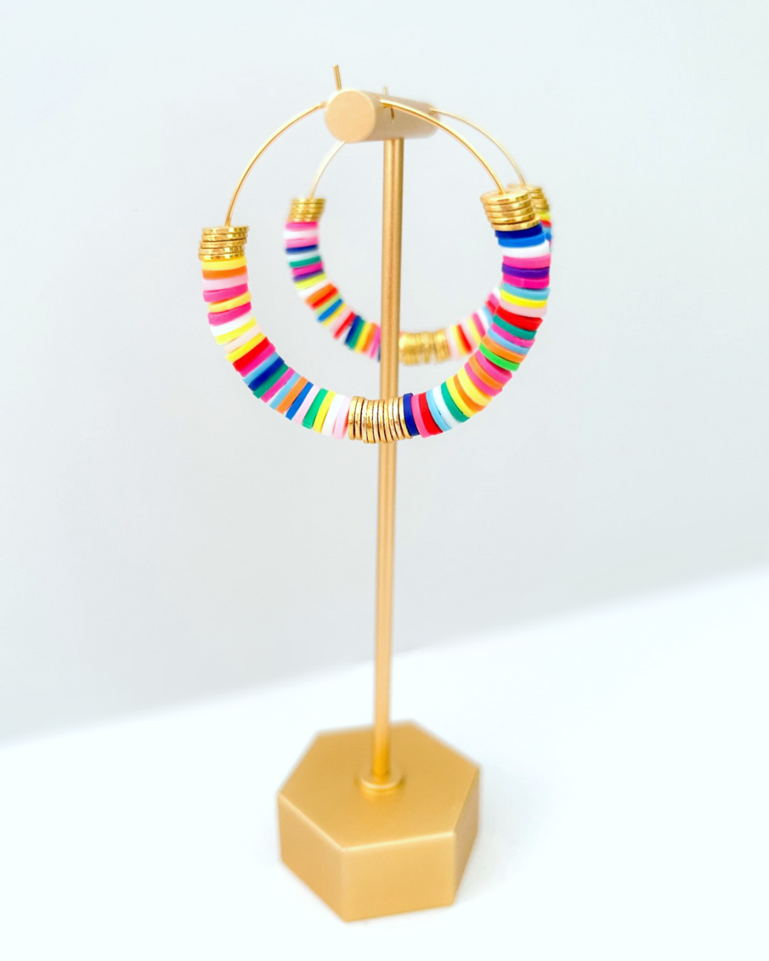 Heishi Bead earrings with gold accents. These handmade earrings are centered with a cluster of gold disc beads and surrounded by multi-color heishi beads with gold accents at each end. These earrings are perfect for adding that extra touch of sophistication to any outfit. With its unique combination of vibrant colors and sleek gold accents, you'll be sure to stand out in any crowd!