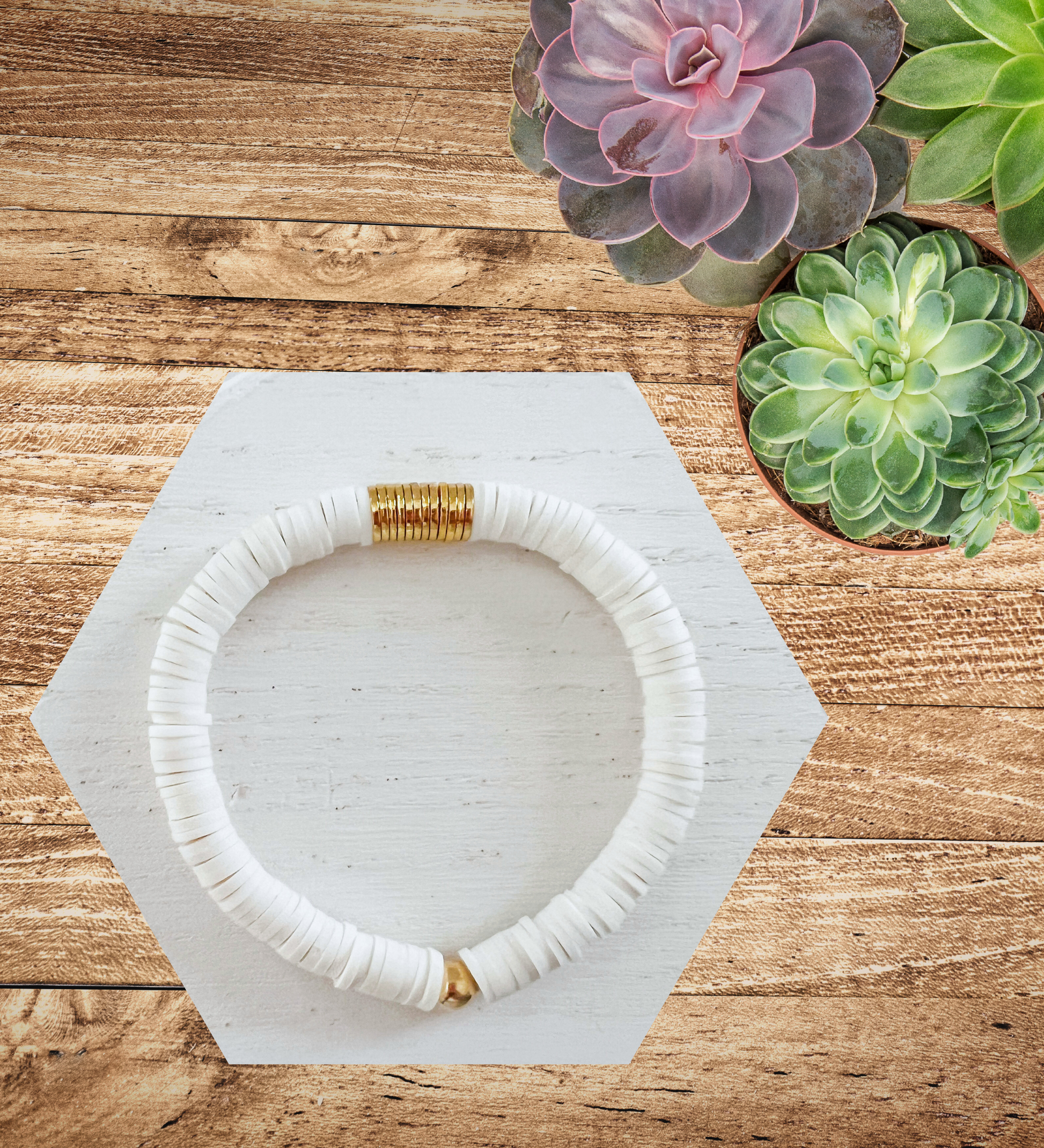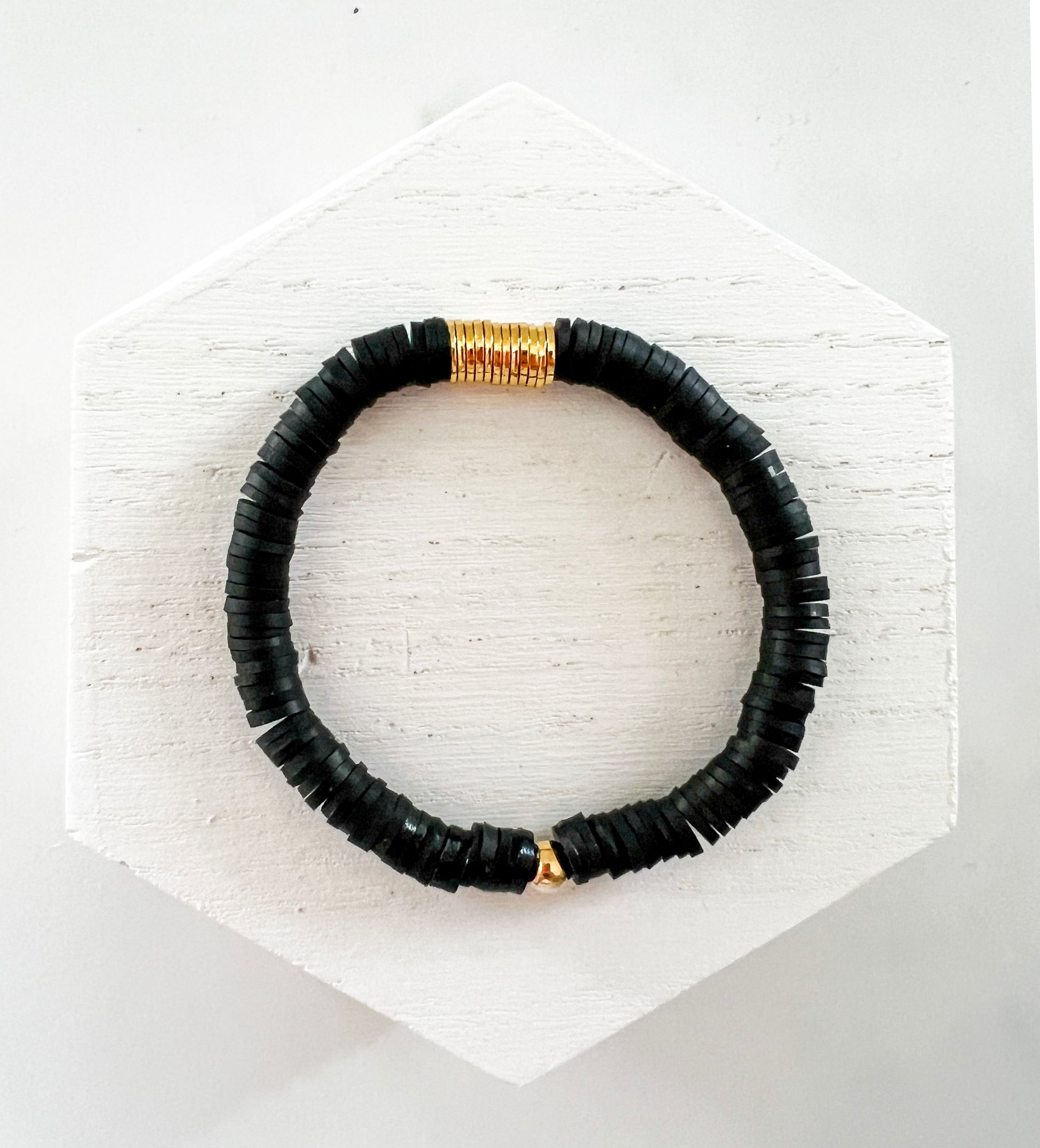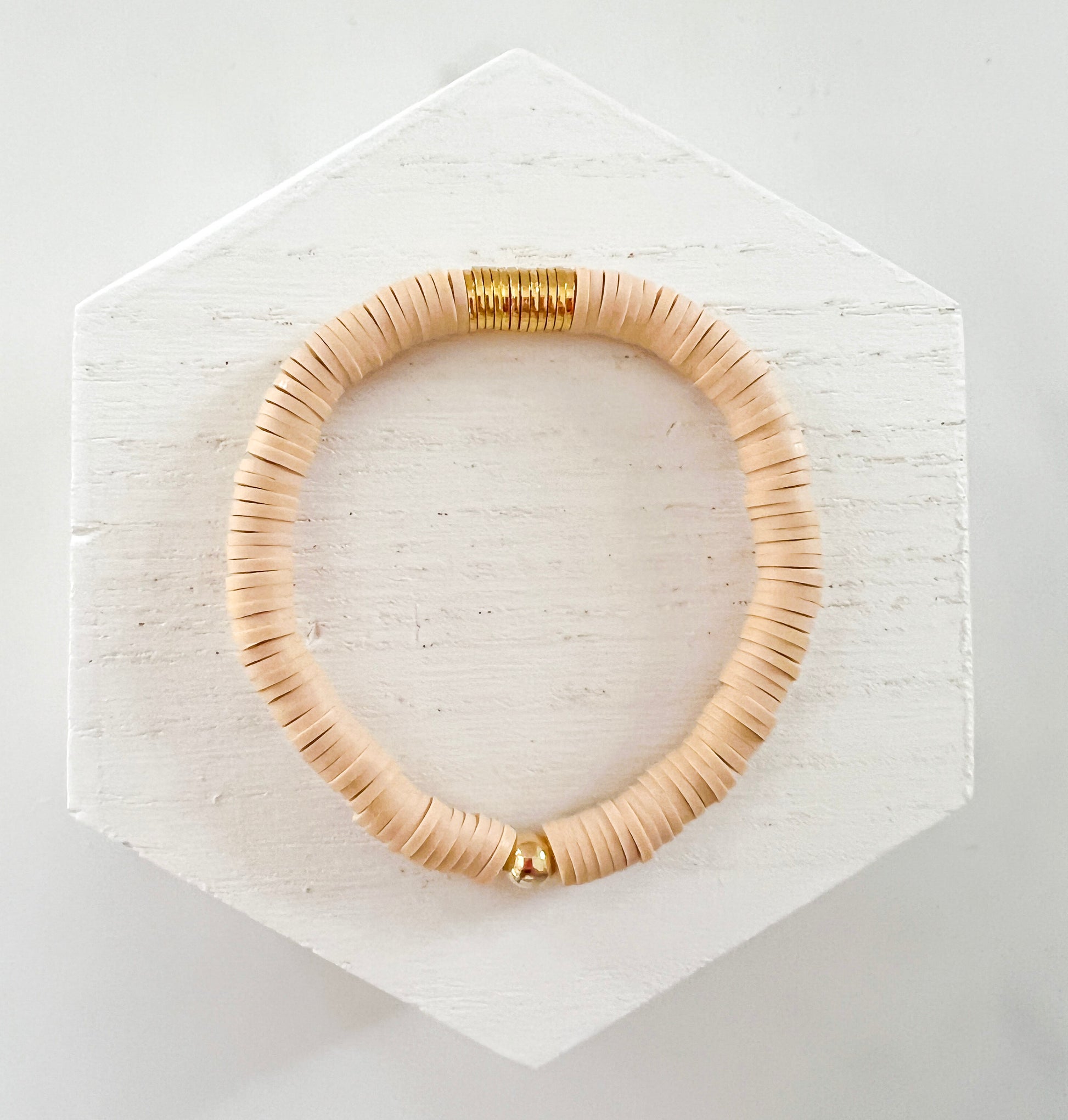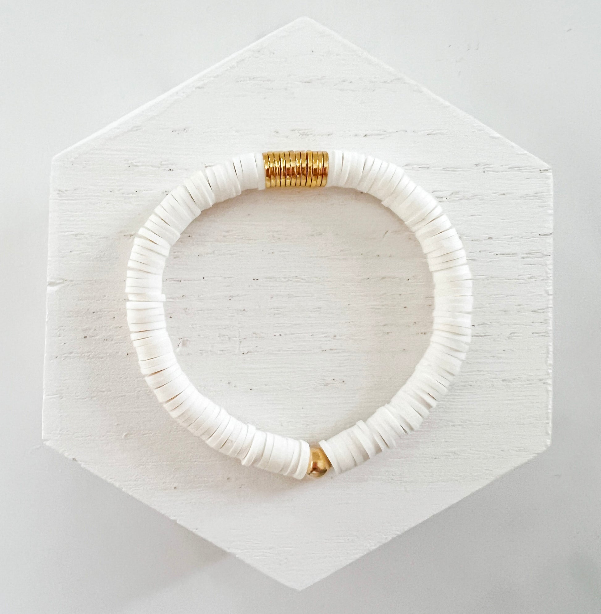 This bracelet is handmade and centered with a thin cluster of gold flat disc beads and surrounded with 6mm heishi beads. The bracelet offers a subtle yet eye-catching aesthetic that is sure to complete any outfit.