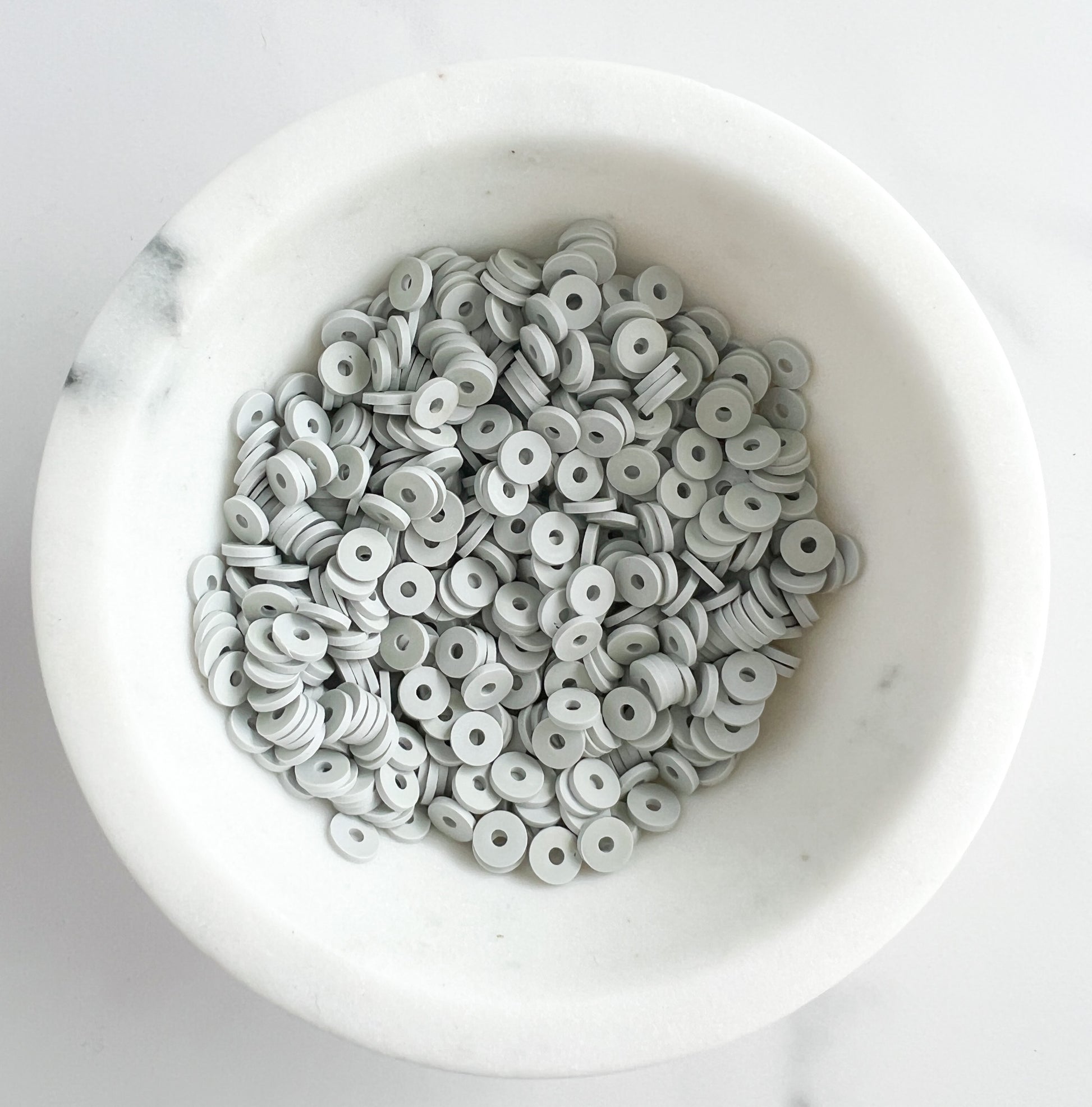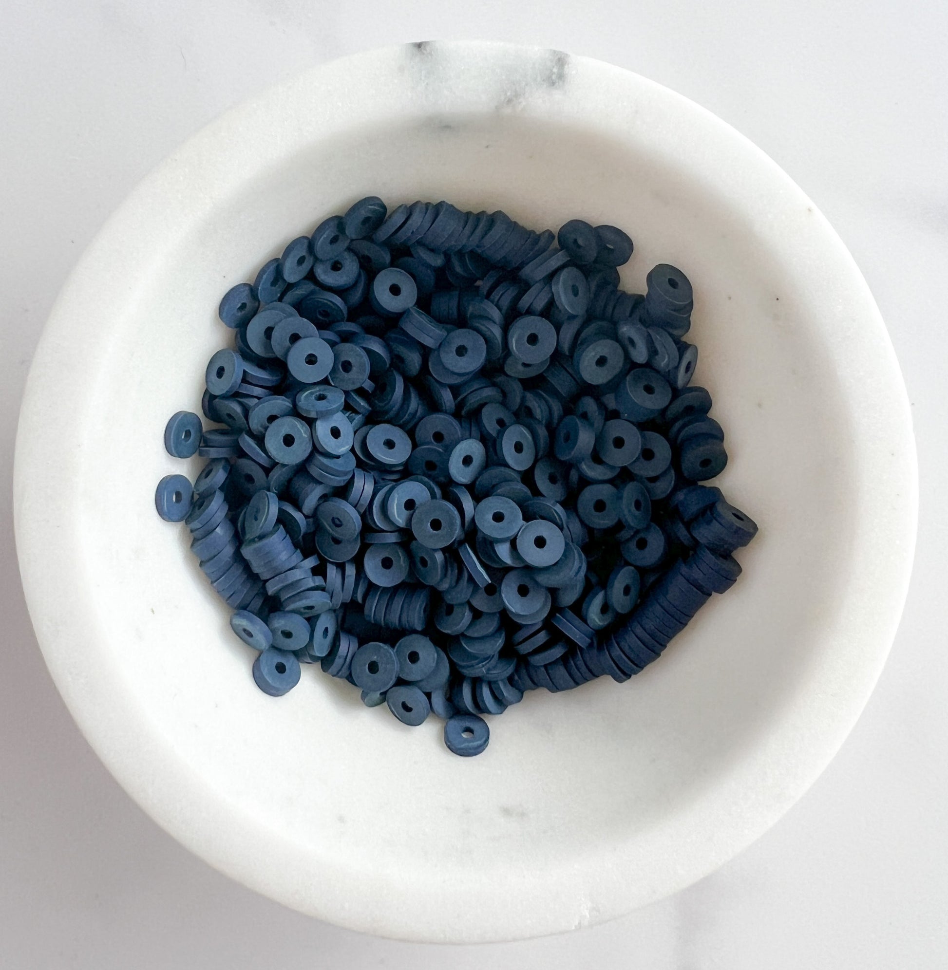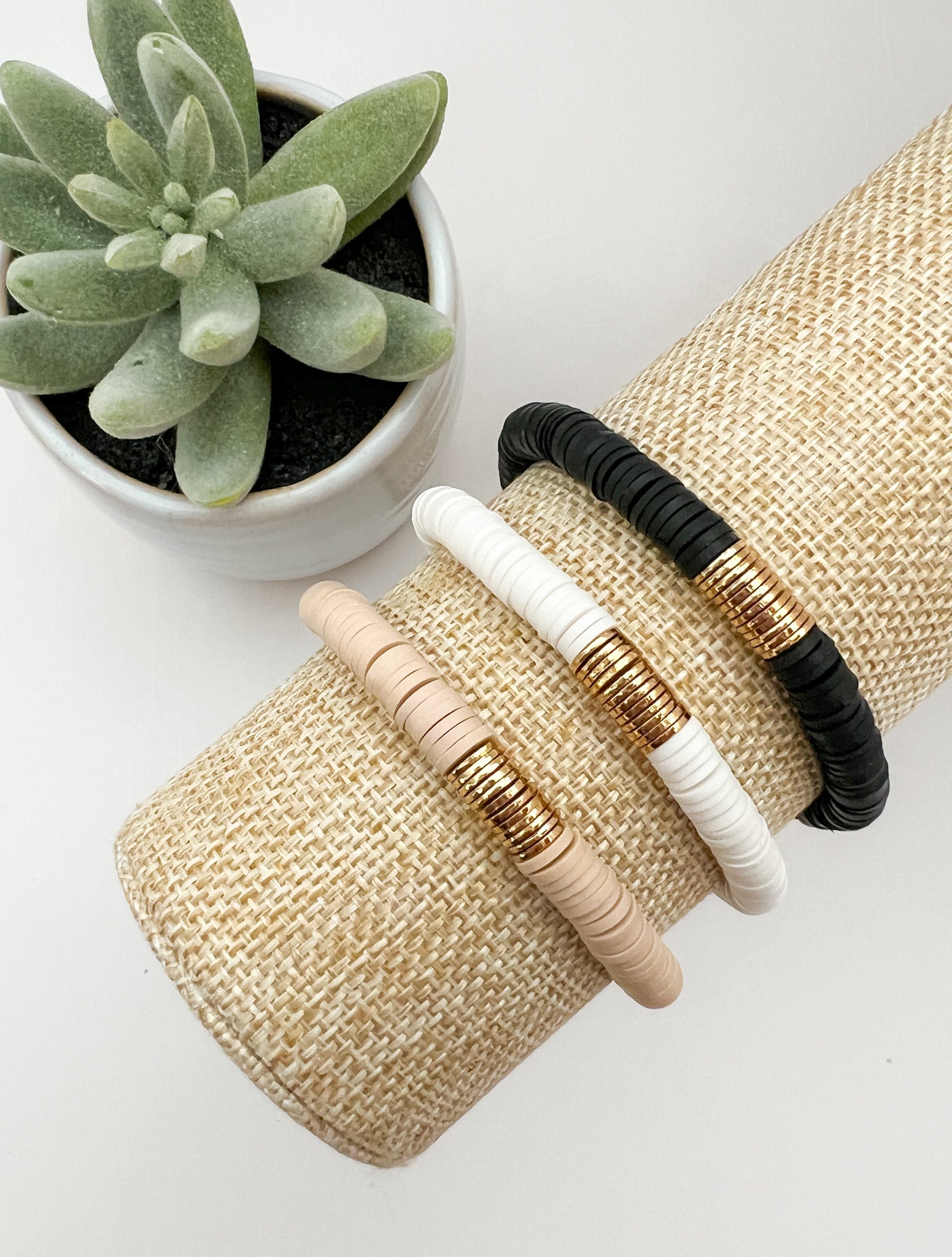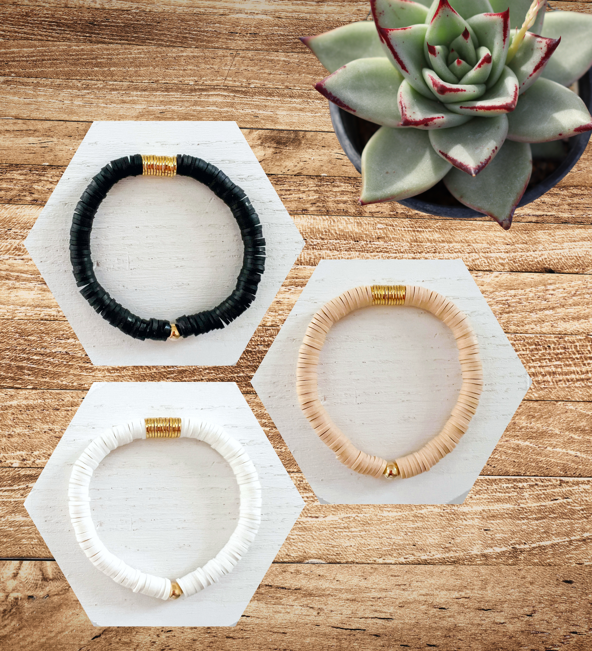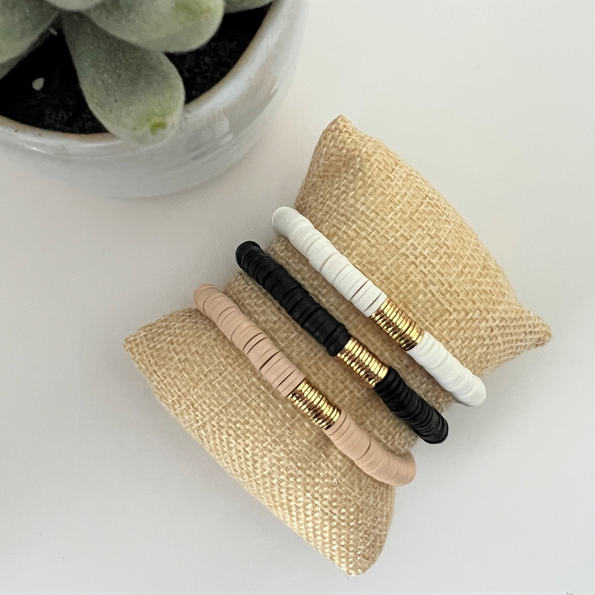 This bracelet is handmade and centered with a thin cluster of gold flat disc beads and surrounded with 6mm heishi beads. The bracelet offers a subtle yet eye-catching aesthetic that is sure to complete any outfit.