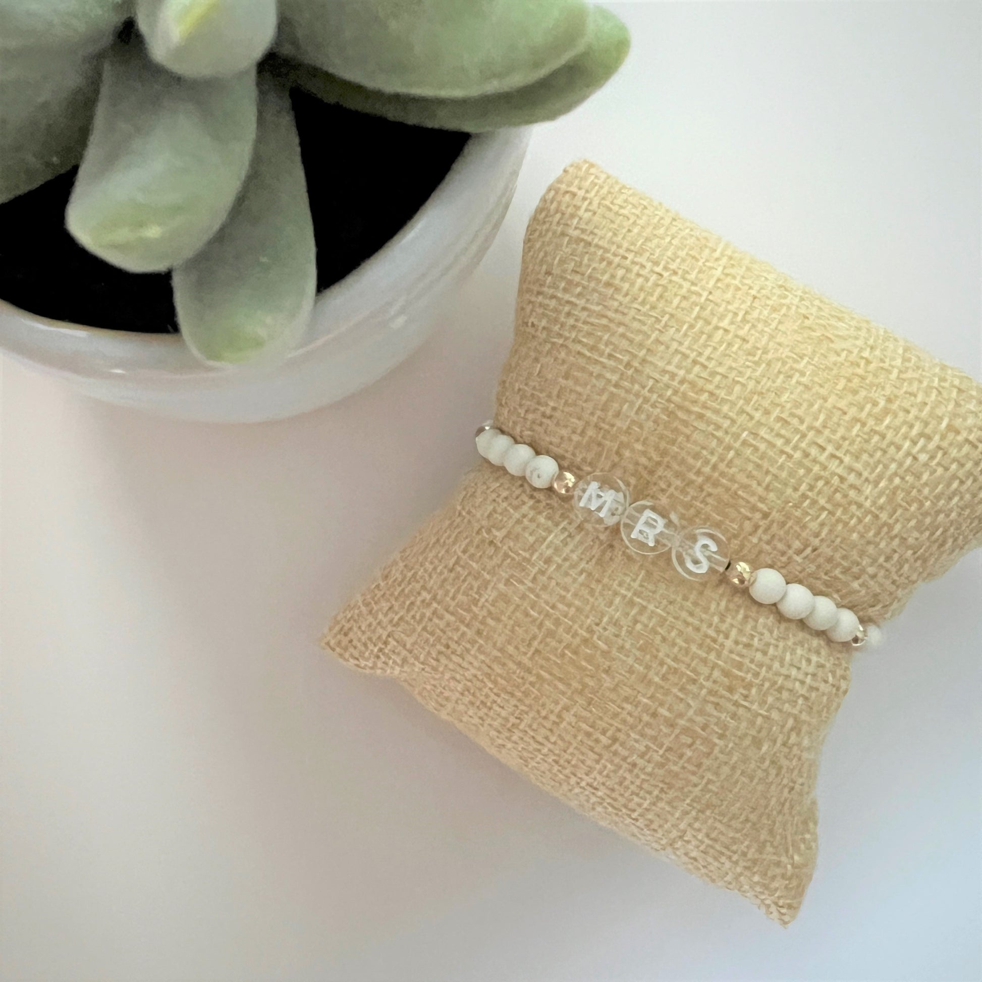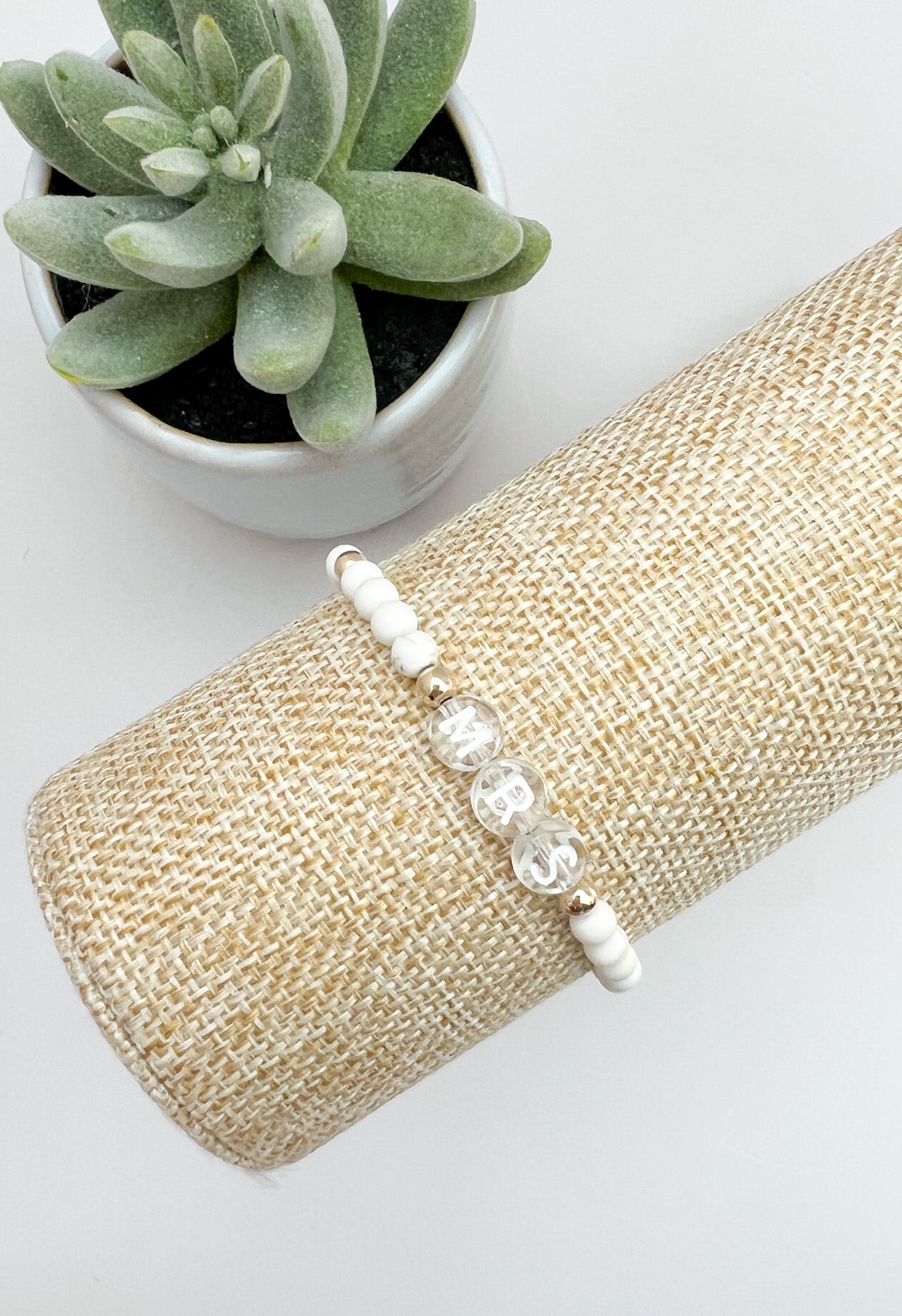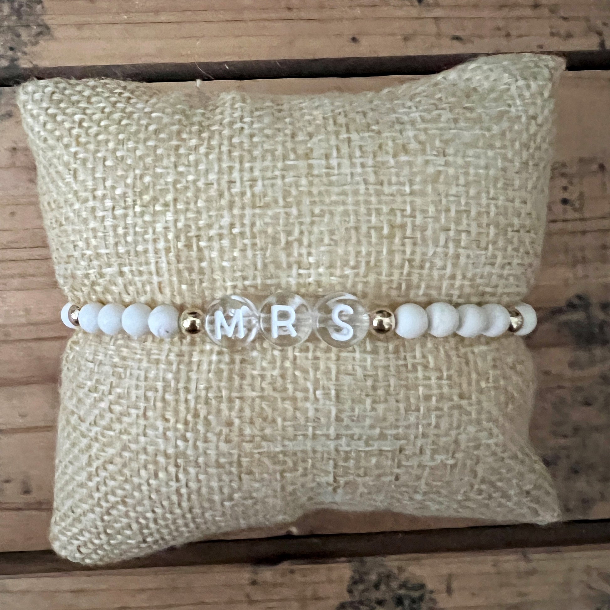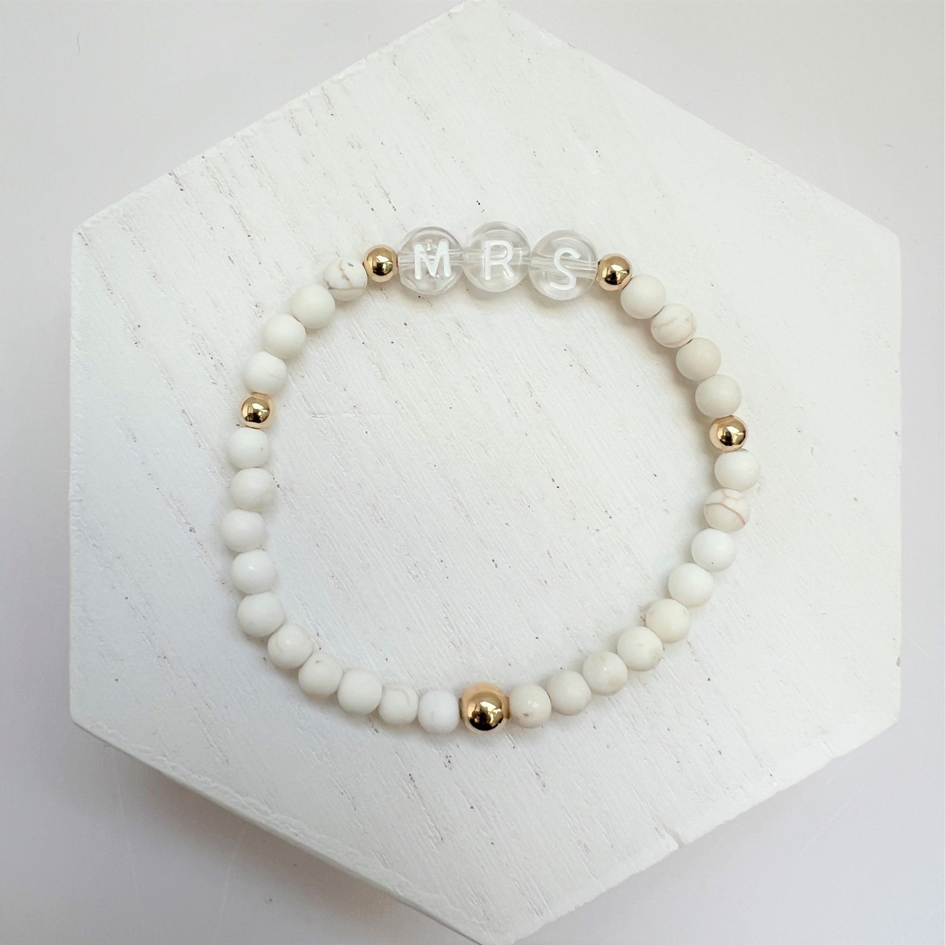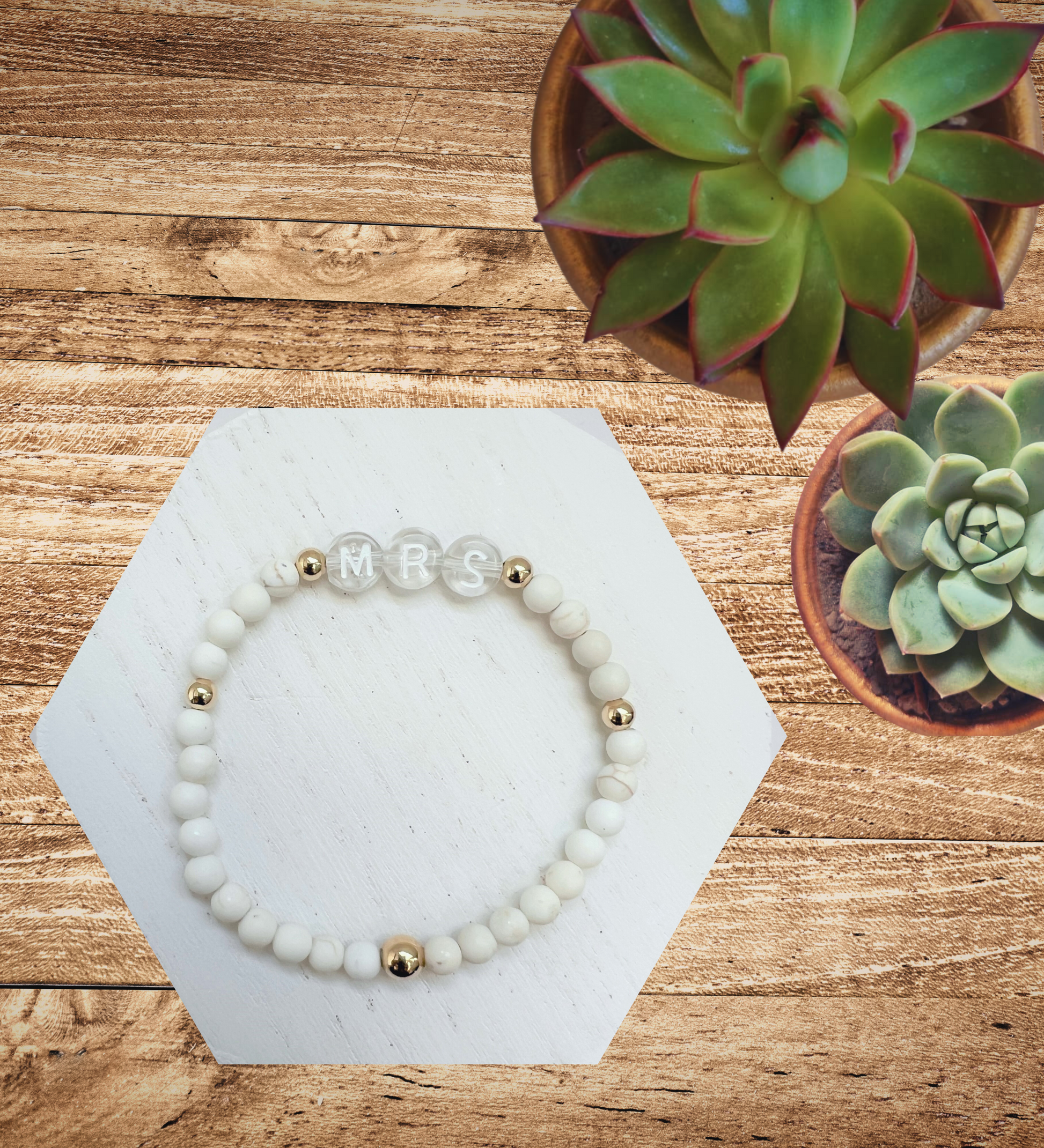 This bracelet is handmade and centered with the letters MRS surrounded by natural white turquoise gemstones and 14k gold-filled accent beads. A timeless piece of jewelry that's sure to catch plenty of hearts and eyes! Slip on this bracelet and get ready to take on the world in style!