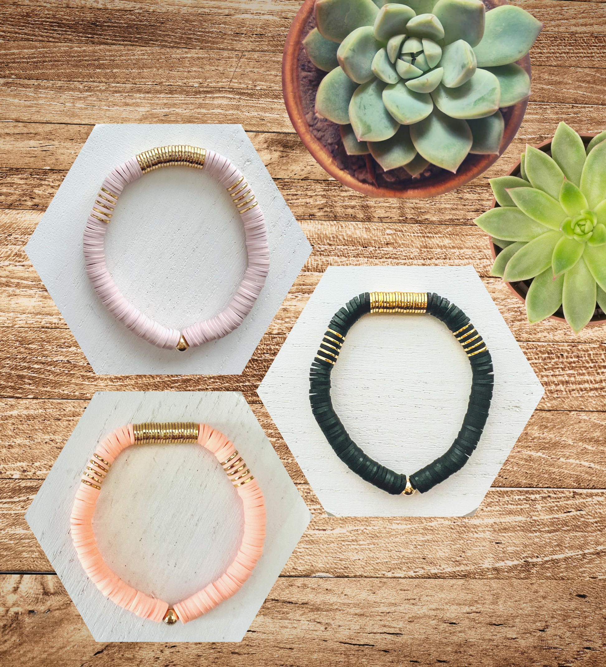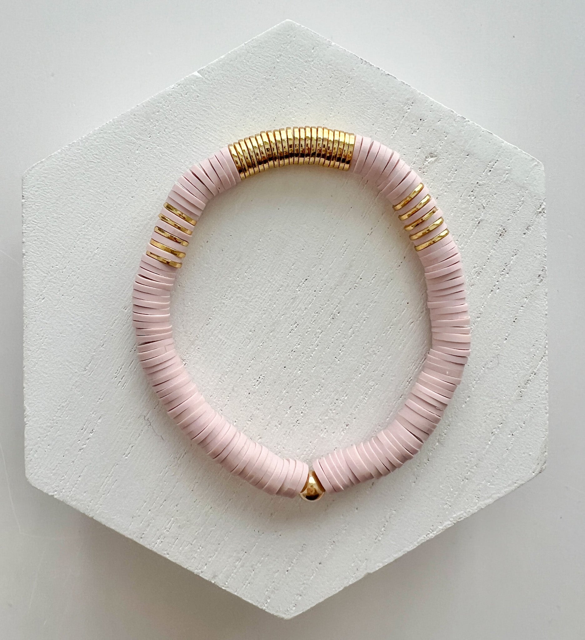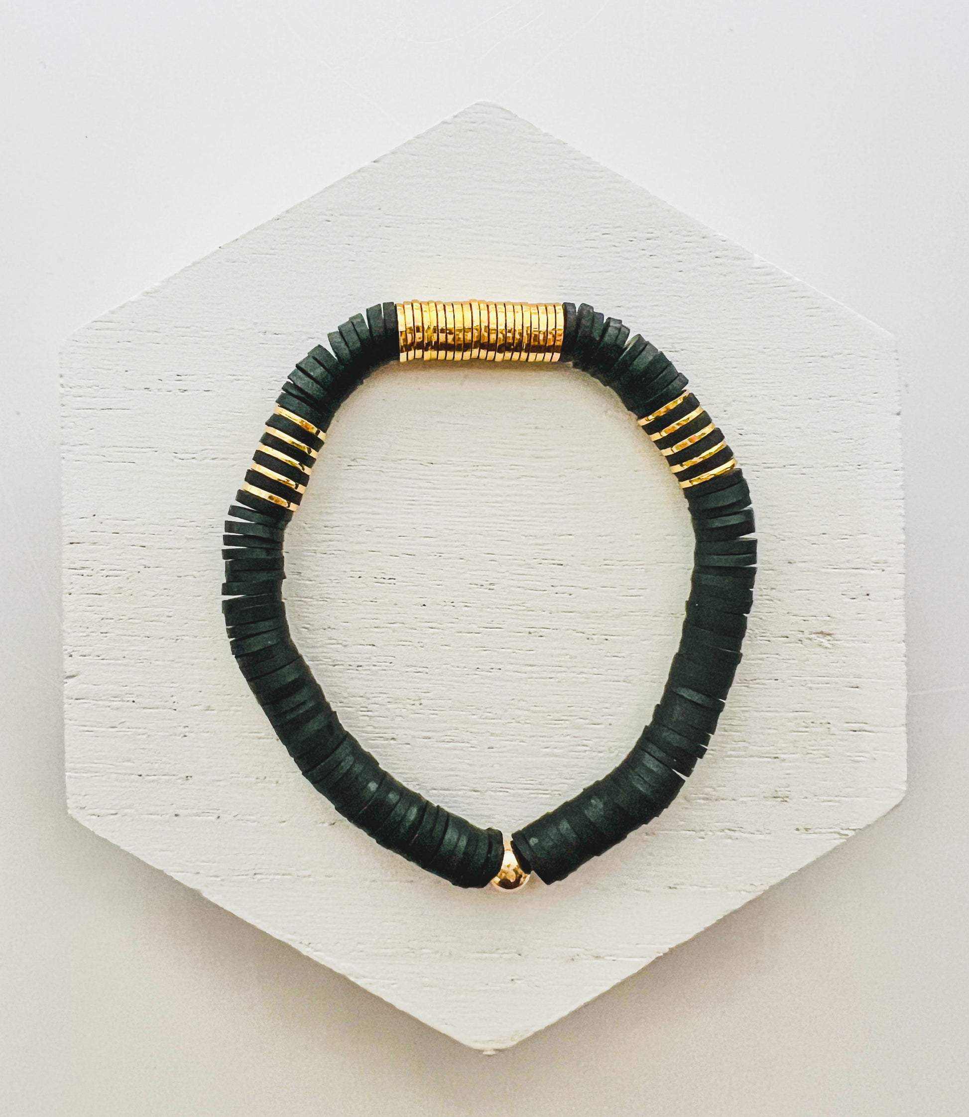 This bracelet is handmade and centered with a thick cluster of gold flat disc beads and surrounded with 6mm heishi beads with gold accent beads. A timeless treasure! Layer it with other bracelets for a look that's all you - or wear it solo for a subtle, classic sparkle.