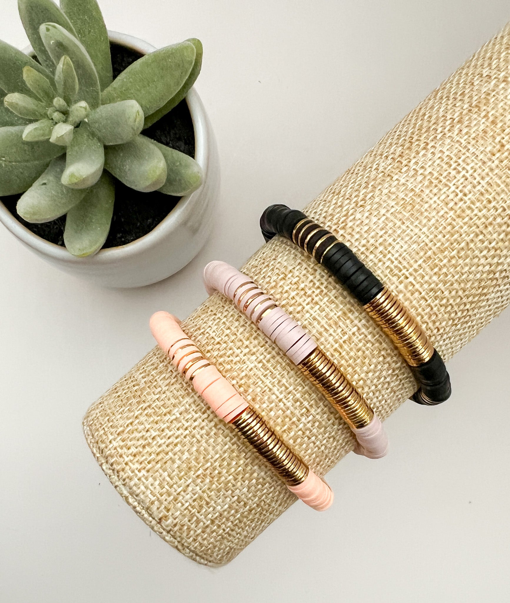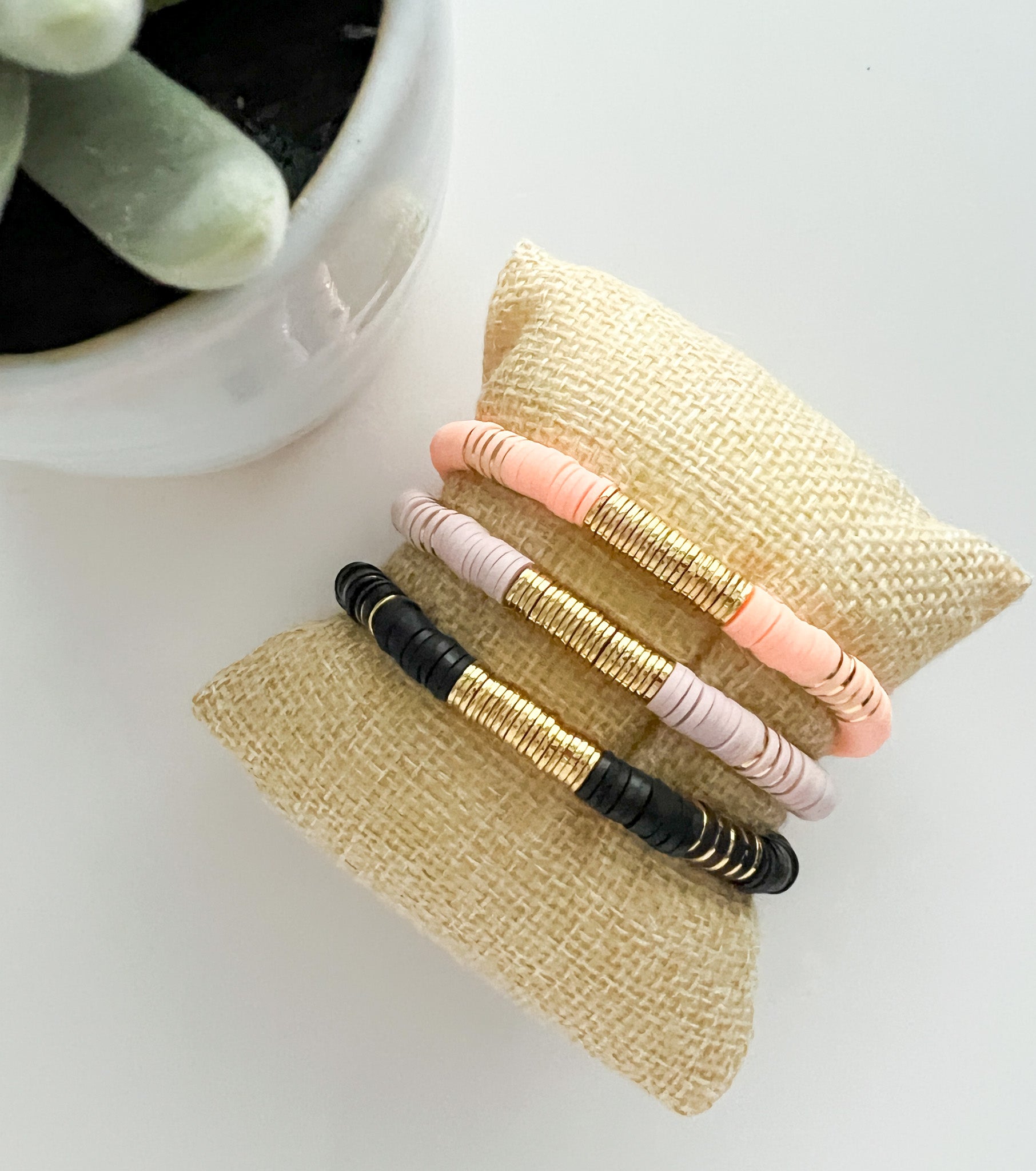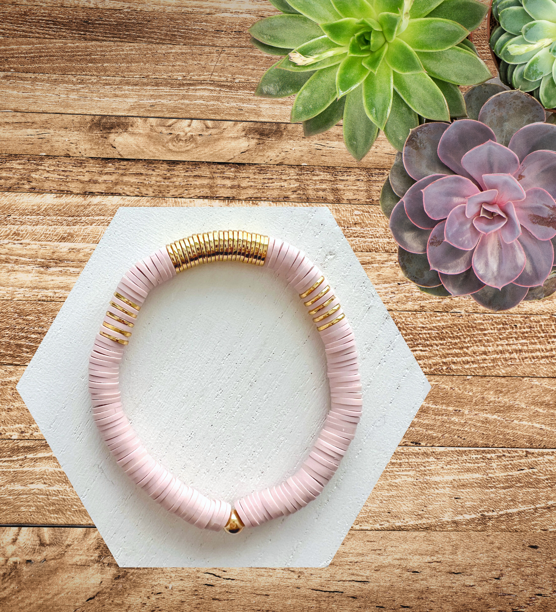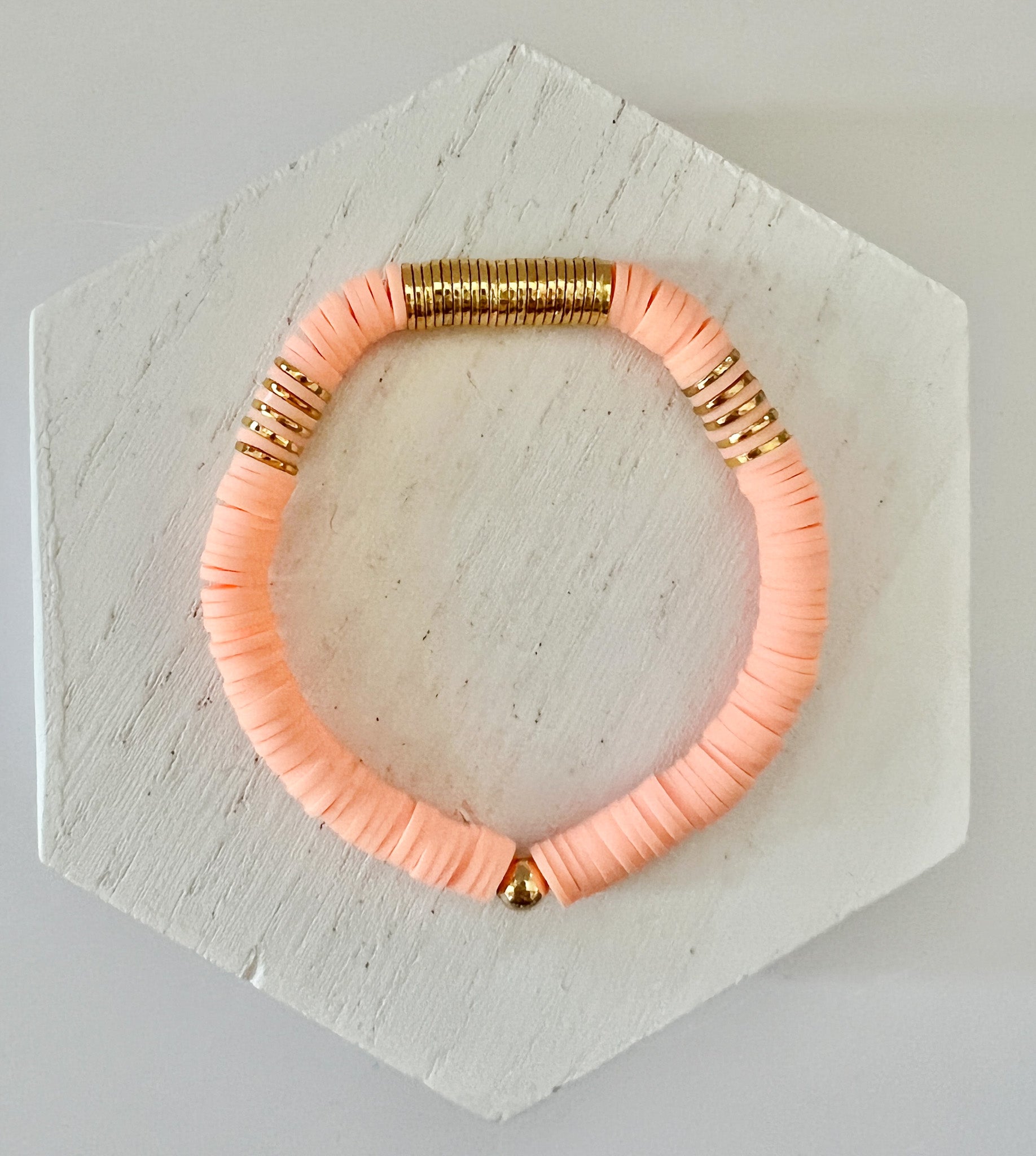 This bracelet is handmade and centered with a thick cluster of gold flat disc beads and surrounded with 6mm heishi beads with gold accent beads. A timeless treasure! Layer it with other bracelets for a look that's all you - or wear it solo for a subtle, classic sparkle.